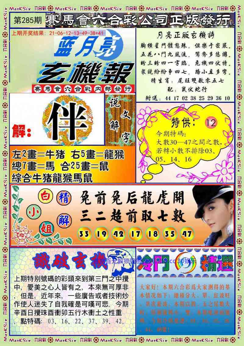 285期:⑧肖 | 蛇马龙猴猪鼠兔牛 | 开:马24中 |