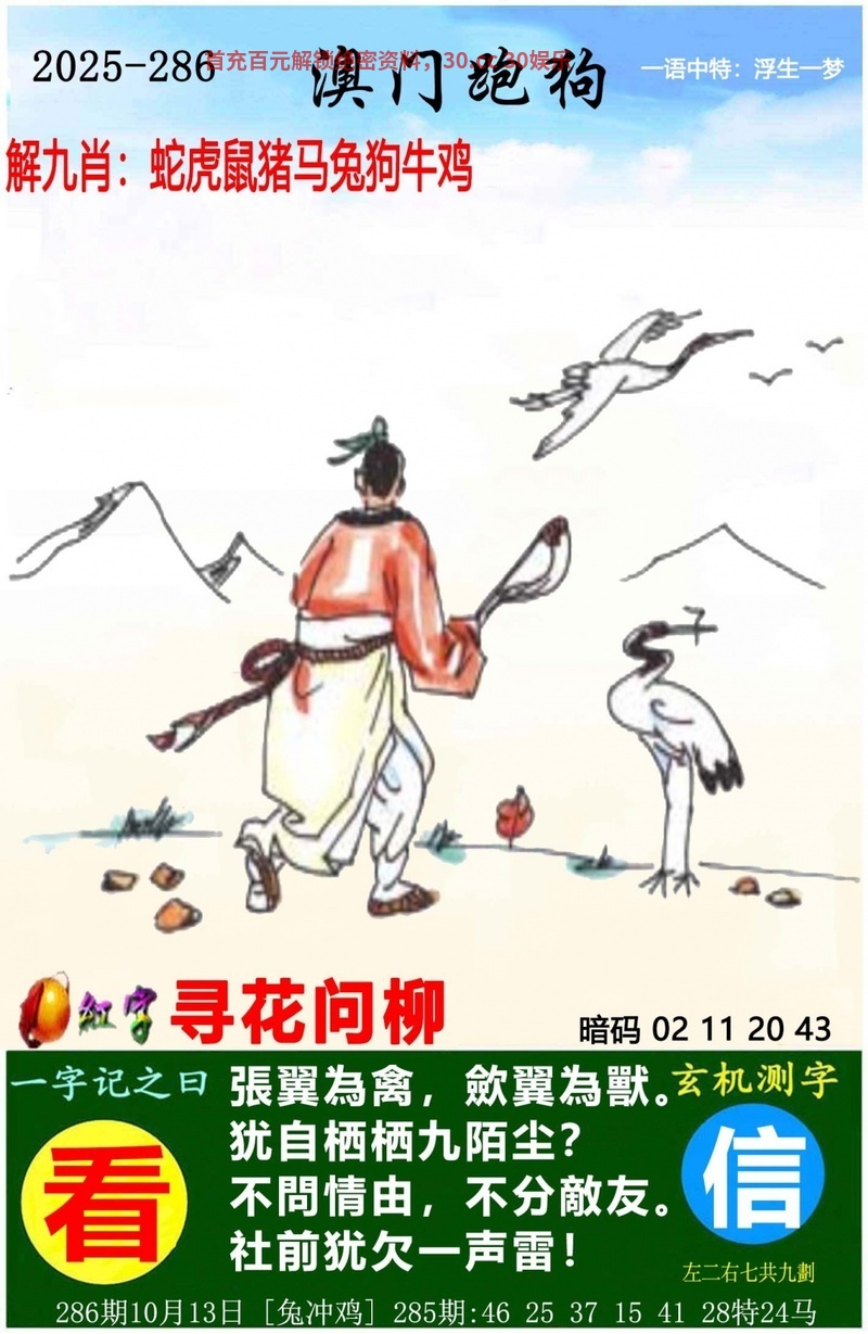 287期:解析澳门传真 今期生肖三十开,二五想合一七来。 木命必定是圣旨,仙鹤空中来观望。 南天门上显神威,不知赌钱搏大彩。 猴羊共午看今期,龙凤呈祥民安乐。 一无所有 解:今期生肖三十开,二五想合一七来。三十解鼠,二五解蛇,一七解牛。木命必定是圣旨,仙鹤空中来观望。木肖虎兔。南天门上显神威,不知赌钱搏大彩。南肖蛇鸡牛,神威解天肖牛猪兔马猴龙。猴羊共午看今期,龙凤呈祥民安乐。明肖猴羊龙。 拐特九肖:鼠蛇牛虎兔马羊猴龙 |
